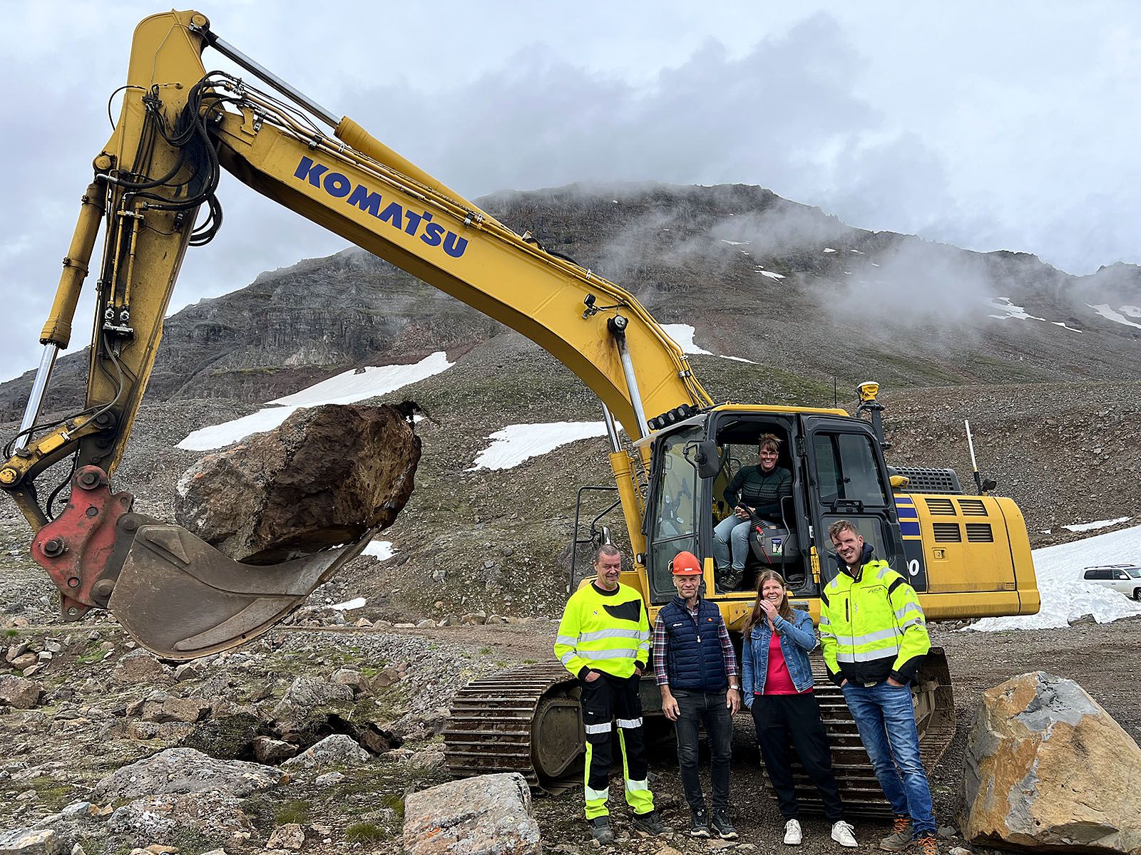 Frá athöfninni í dag. Frá vinstri: Vilhjálmur Konráðsson verkstjóri frá Héraðsverki, Magnús Baldur Kristjánsson framkvæmdastjóri MVA, Hugrún Hjálmarsdóttir sviðsstjóri umhverfis- og framkvæmdasviðs Múlaþings og Guðmundur Magni Bjarnason frá Verkfræðistofunni Eflu. Jónína Brynjólfsdóttir, forseti sveitarstjórnar Múlaþings, situr í gröfunni. Mynd: Múlaþing/Heiða Ingimarsdóttir.