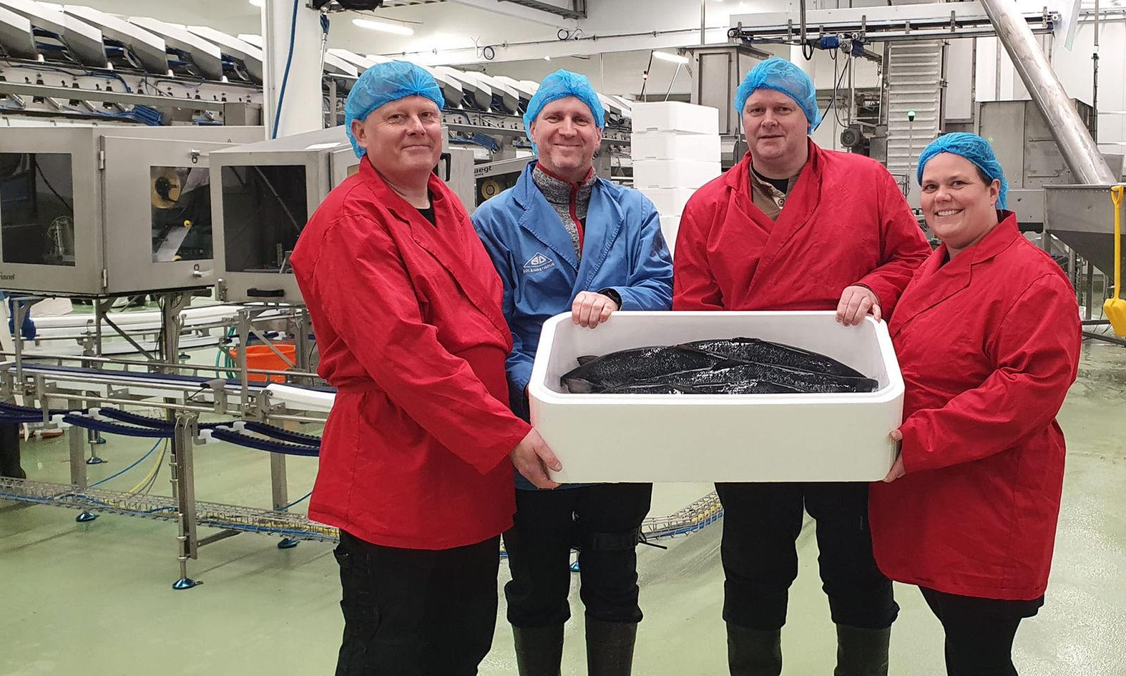 Aðstandendur kassaverksmiðju Bewi-Iceland og Búlandstinds með lax í einum af fyrstu kössunum. Mynd: BEWI/Jóna Kristín