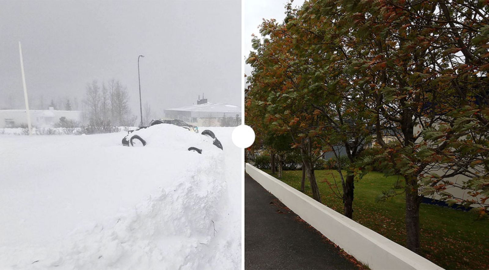 Myndirnar frá 27. mars eru til vinstri en nýjar myndir til hægri. Hægt er að bera þær betur saman með að renna stikunni sem skilur þær að í miðju til hliðanna. Myndir frá 27. mars: Landsbjörg/Hlynur Sveinsson