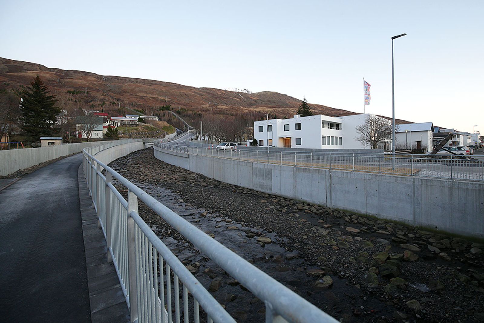 Eiginlegum framkvæmdum, það er uppbyggingu varna, lauk í desember í fyrra. Þær eru þar með orðnar virkar. Búið er að dýpka og breikka farveginn auk þess að byggja meðfram honum leiðigarða til að taka við flóðum sem kunna að koma niður hann.