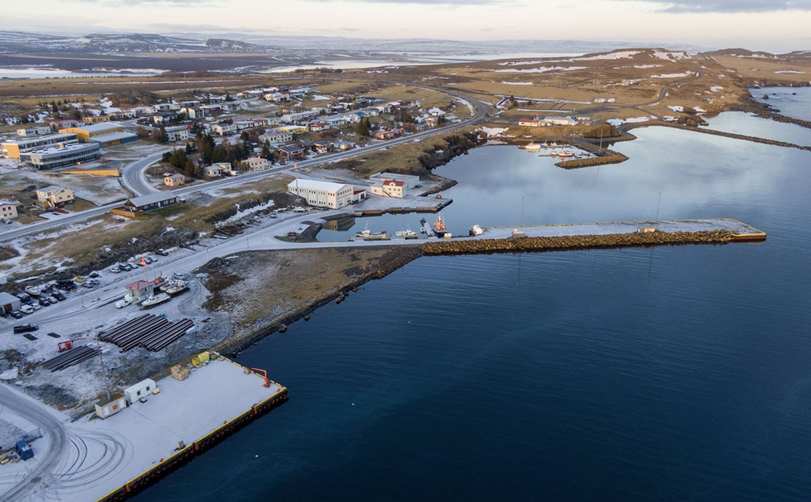 Núverandi löndunarbryggja verður lengd um 130 metra til austurs að Ásgarði. Sjá má núverandi bryggju til vinstri í myndinni en garðurinn gengur þvert út í sjó fyrir henni miðri. Fjær er smábátahöfnin. Mynd: GG