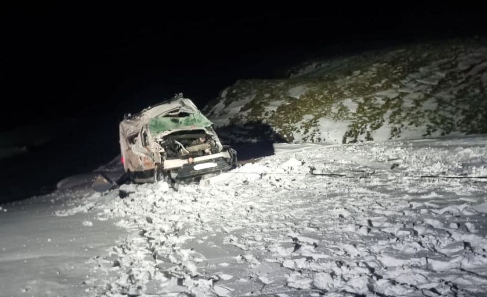 Bíllinn fór út af í hálku og fór 2-3 veltur. Einn farþeganna kastaðist út úr bílnum og lenti undir honum. Mjúkt undirlag virðist hafa bjargað honum.