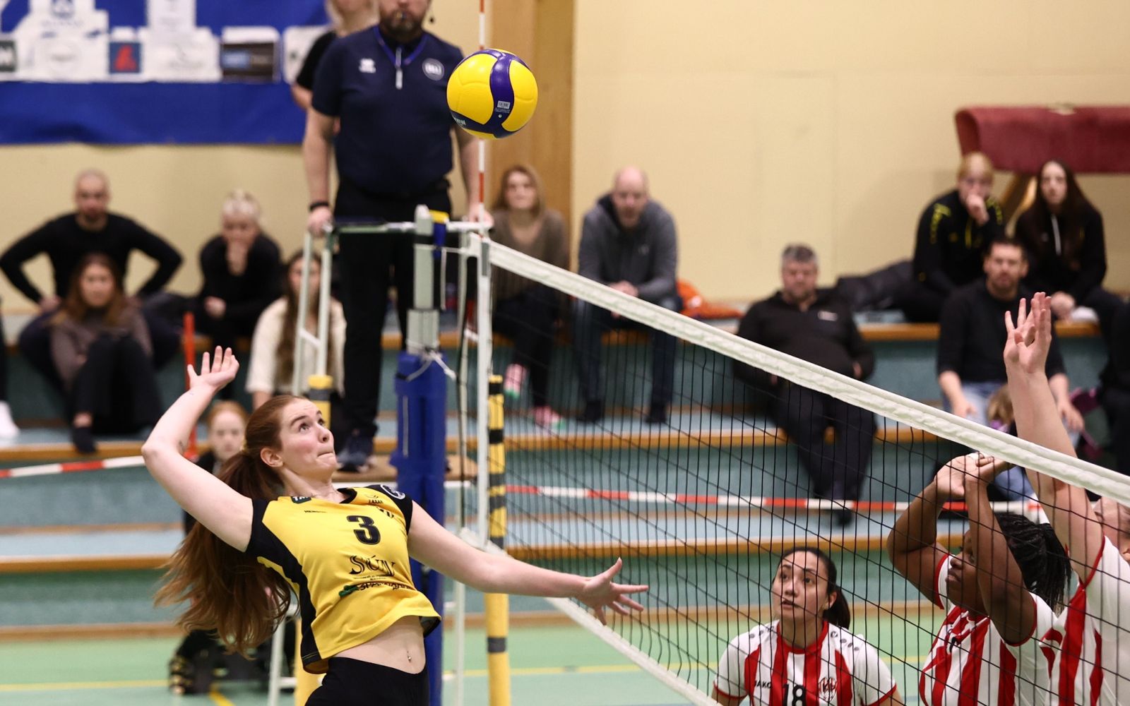 Í fyrstu hrinu kvennaleiksins var jafnt á tölunum upp í 11-11, að Þróttur Neskaupstað skoraði fjögur stig í röð og komst yfir 15-11. Heimaliðið lét síðan kné fylgja kviði og kláraði hrinuna 25-16.