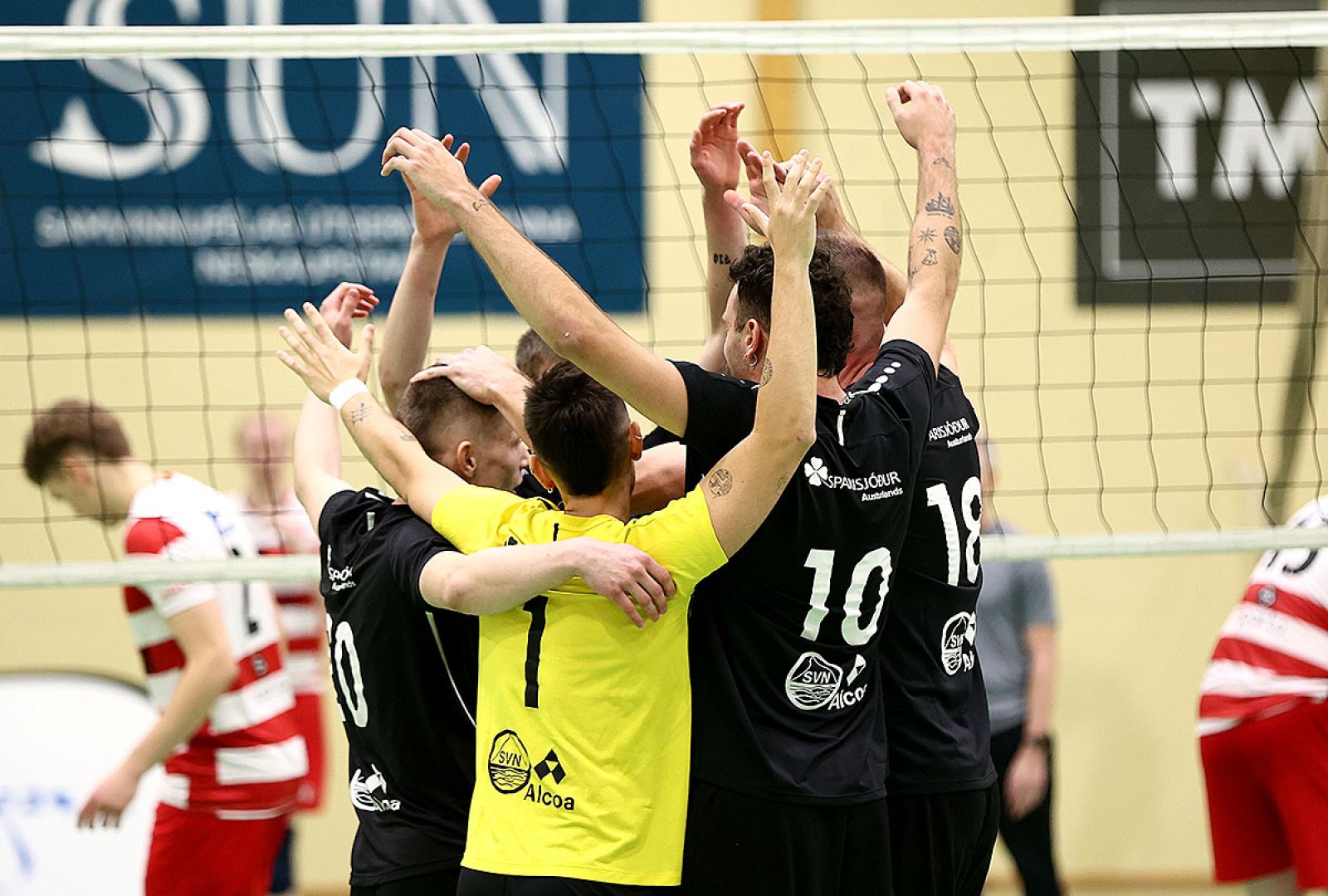 Þróttur náði undirtökum í karlaleiknum um miðja fyrstu hrinu. HK jafnaði þó þrisvar í lokin, síðast í 21-21 en komst aldrei yfir og Þróttur vann 25-22.