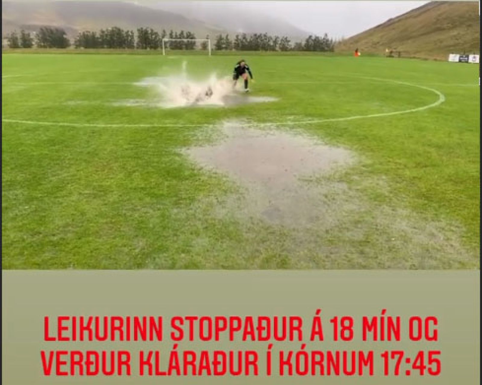 En á átjándu mínútu taldi dómari leiksins að nóg væri komið, stöðvaði leikinn og hélt til fundar við þjálfarana. Svo vel vildi til að mótastjóri KSÍ, Austfirðingurinn Birkir Sveinsson, var á staðnum til aðstoðar við að finna lausnir.