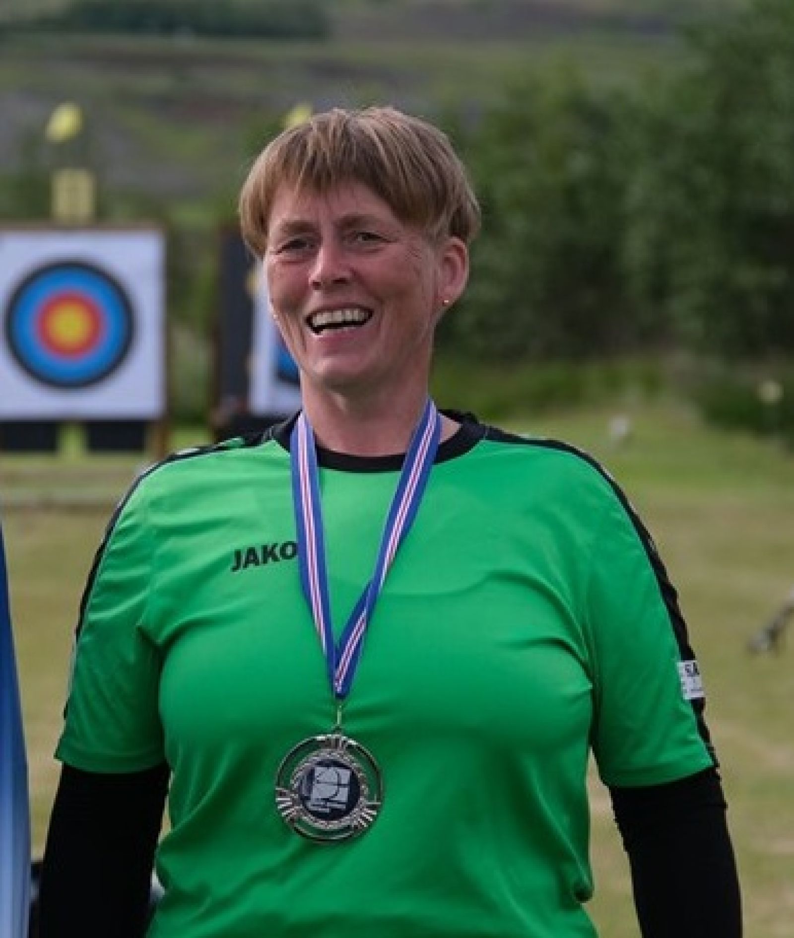 Guðný keppti einnig í berbogaflokki en þar jafnaði hún Guðbjörgu Reynisdóttur úr BF Hróa Hetti en tapaði svo bráðabana. Það mátti því ekki miklu muna að Guðný hefði orðið tvöfaldur Íslandsmeistari. „Ég hef ekkert æft berbogann nema bara í svona mánuð, ég ákvað nú bara að vera með í því svona uppá gamanið en svo gekk það bara svona glimrandi vel líka,“ segir Guðný Gréta. Guðný varð þó í raunninni þrefaldur Íslandsmeistari á mótinu því hún keppti líka í flokki 50+ og sigraði báðar greinar þar.