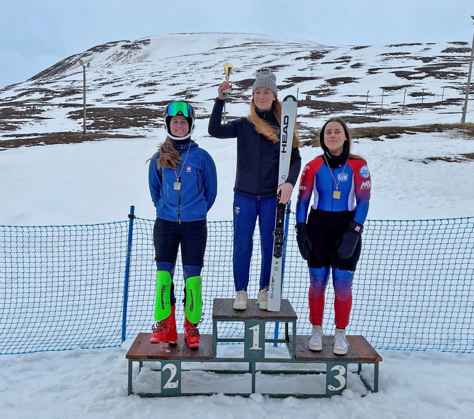 Jóhanna Lilja, lengst til hægri, á palli á Skíðamóti Íslands í vetur. Mynd: Skíðasamband Íslands.