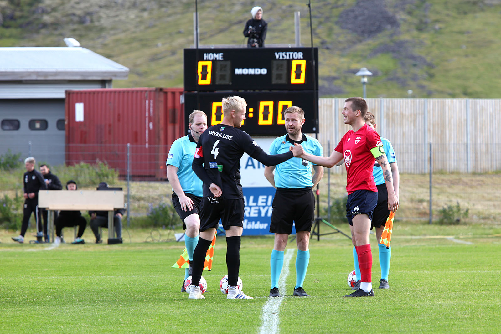 Skömmu áður hafði hlaupið hiti í leikinn eftir harkalega tæklingu á Brynjar Þorra Magnússon, leikmann Hattar/Hugins. Við það virtist einbeiting gestanna dala. Brynjar Þorri haltraði áfram en fór meiddur út í hálfleik.