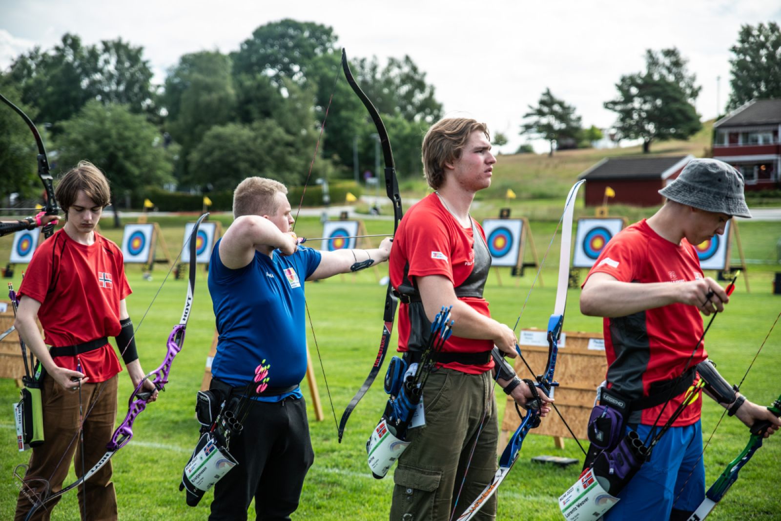 Þórir (í bláu) myndar bogann á mótinu í Larvik en hann kom heim aftur með tvenn bronsverðlaun. Mynd Bogfimisamband Íslands