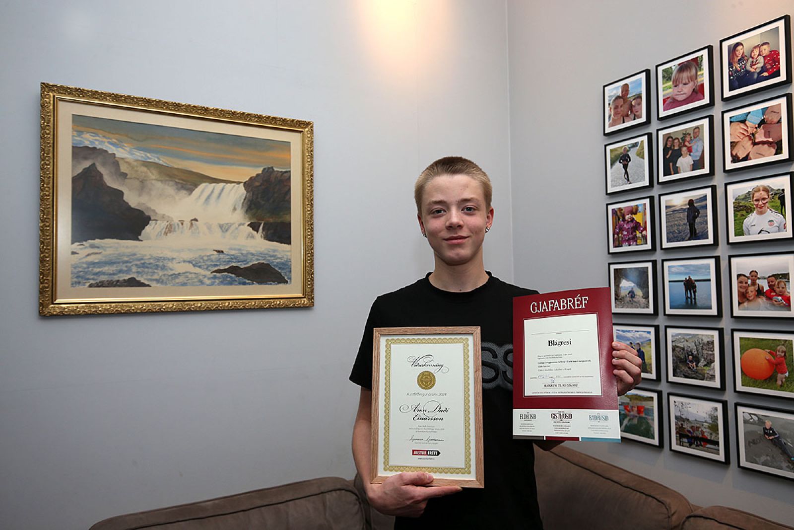 Sem Austfirðingur ársins fær Aron Daði viðurkenningu frá Austurfrétt/Austurglugganum og gjafabréf frá Gistihúsinu á Egilsstöðum. Tilnefningin kom honum á óvart. „Ég vissi varla hvað þetta var, en mér finnst þetta geggjaður heiður,“ segir Aron Daði sem fékk langflest atkvæði í kjörinu að þessu sinni.