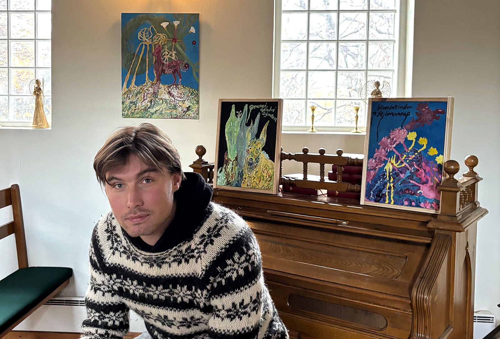 Á sýningunni verða níu málverk og nokkrar teikningar. Opnunin verður á morgun frá klukkan 17-20. Á henni mun Guðrún Veturliðadóttir, tónlistarkennari á Seyðisfirði, spila á gítar og syngja. Sýningin sjálf verður síðan í kirkjunni út veturinn.