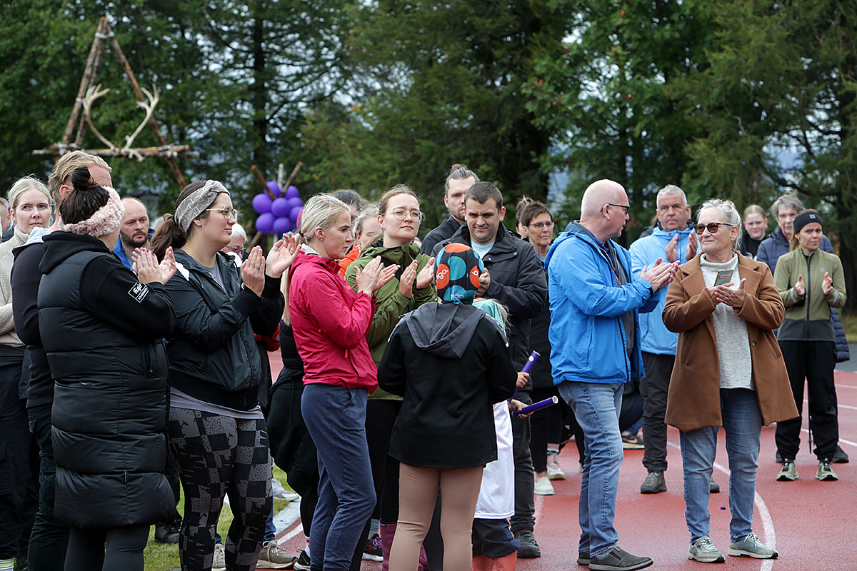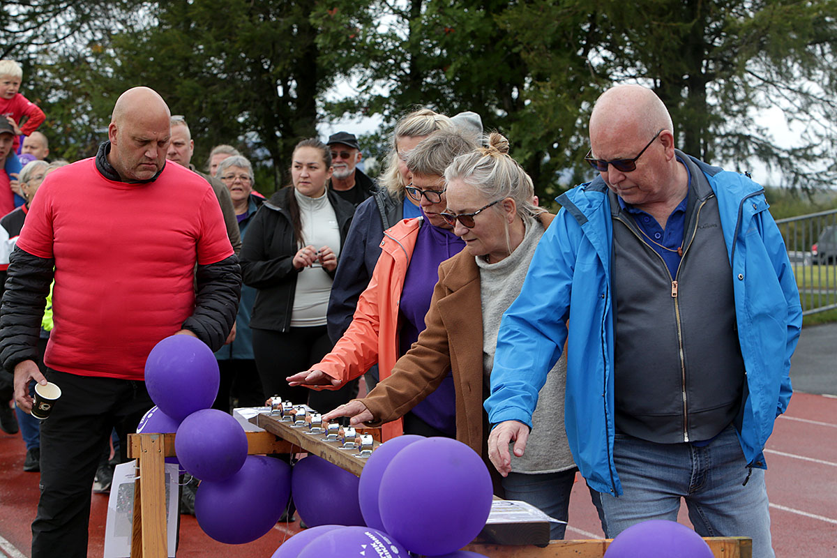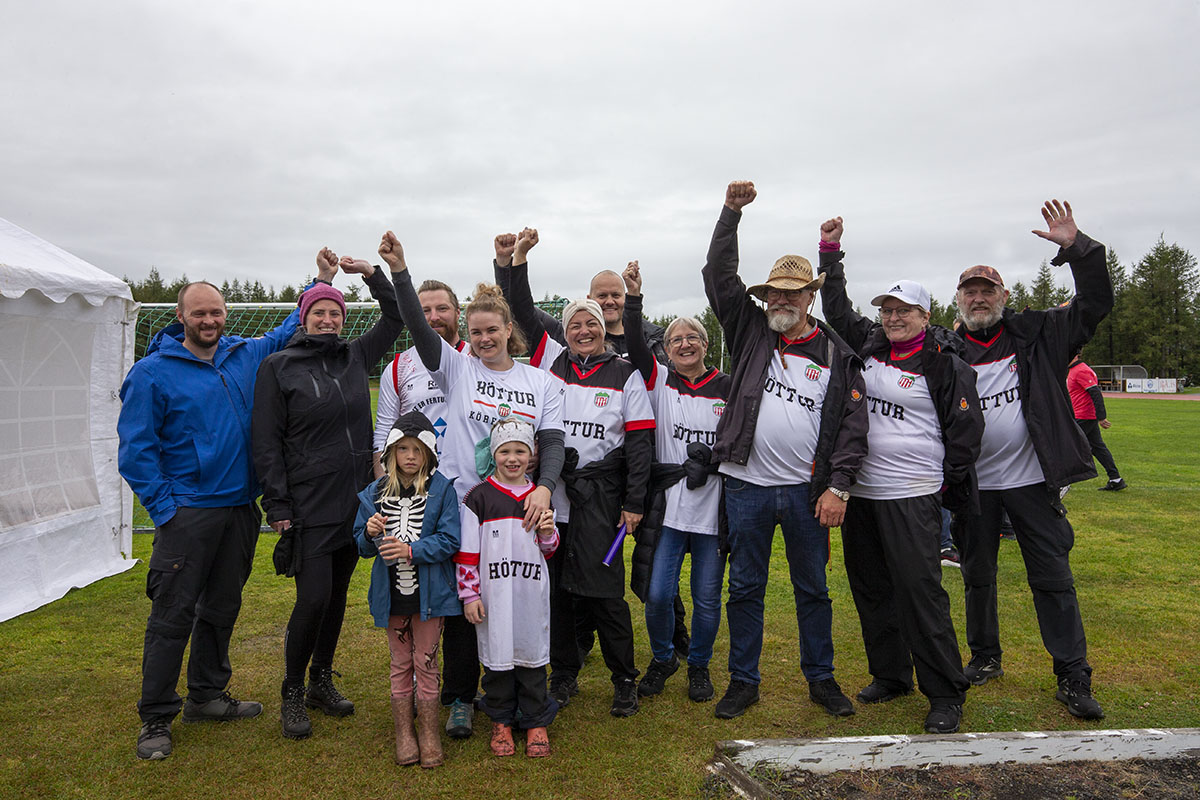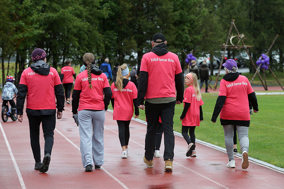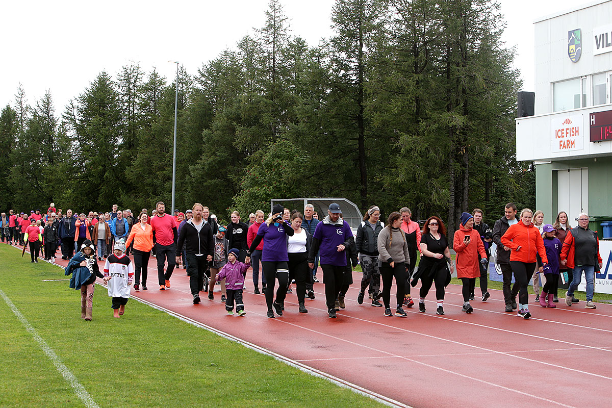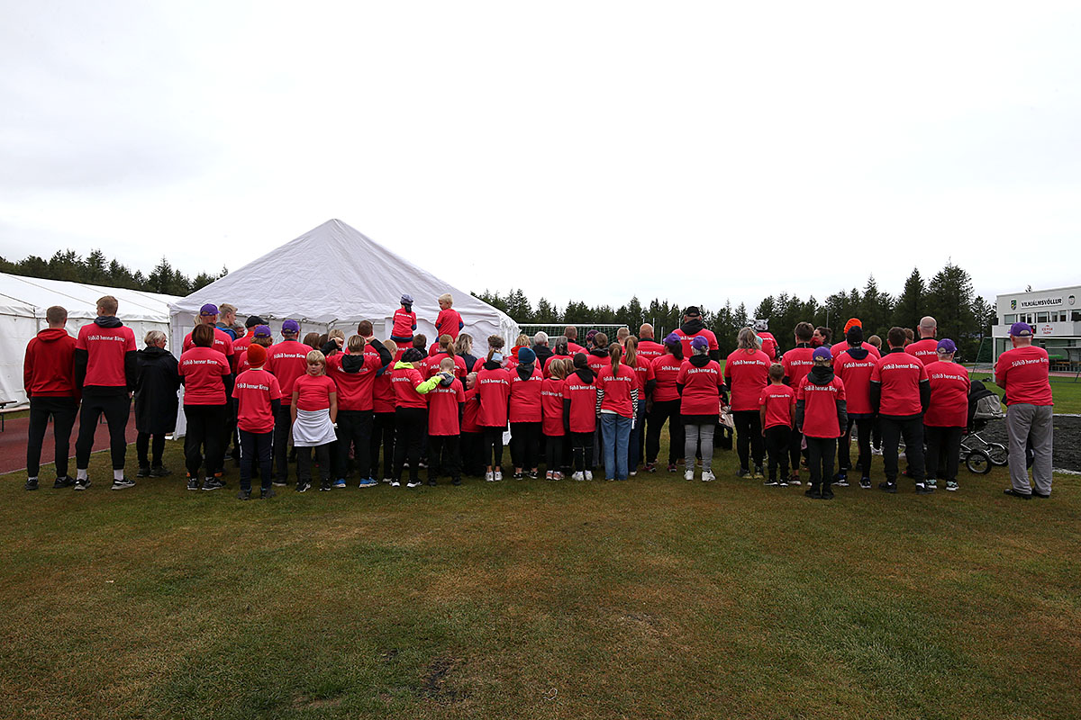 Hugsunin var bæði að safna áheitum með göngunni en líka minna fólk á það bakland sem það hefur í allri baráttunni. Liðin höfðu bækistöðvar í tjöldum sem komið var upp á grasvellinum.