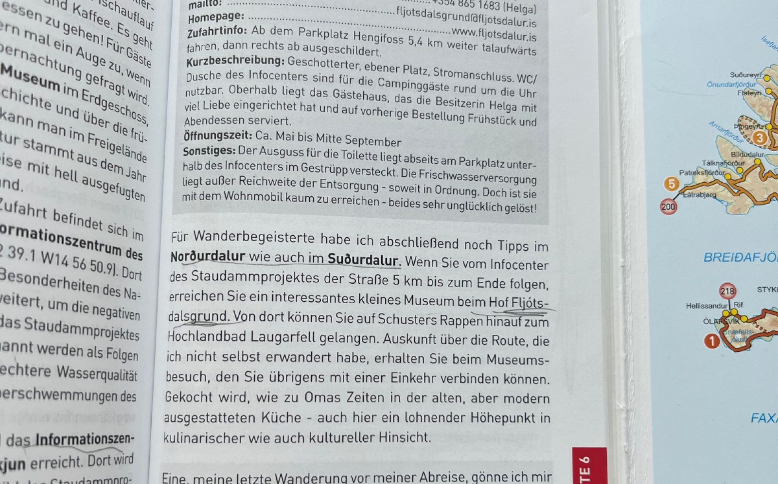 Mynd 2: Sigríður Helga fékk að smella mynd úr ferðahandbók Þjóðverjanna þar sem mælt er með stoppi hjá Helgi í Hengifoss Guesthouse en rúmar tvær síður bókarinnar eru helgaðar Fljótsdal og nærliggjandi svæðum. Mynd aðsend.