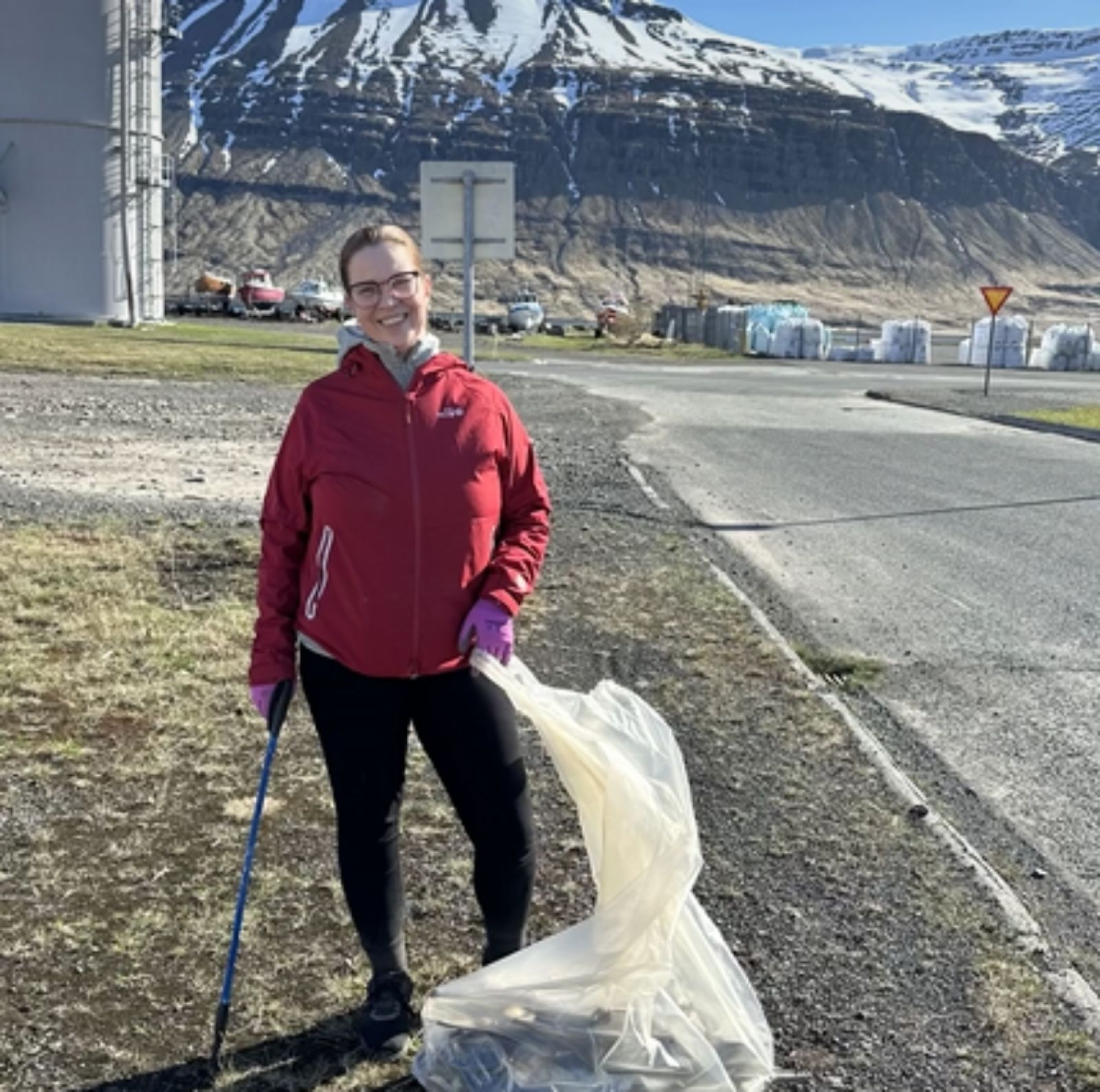 Bæjarstjórinn Jóna Árný Þórðardóttir lét ekki sitt eftir liggja þegar átakið Vor í Fjarðabyggð hófst í gær. Plokkað var töluvert af rusli á Reyðarfirði. Mynd Fjarðabyggð