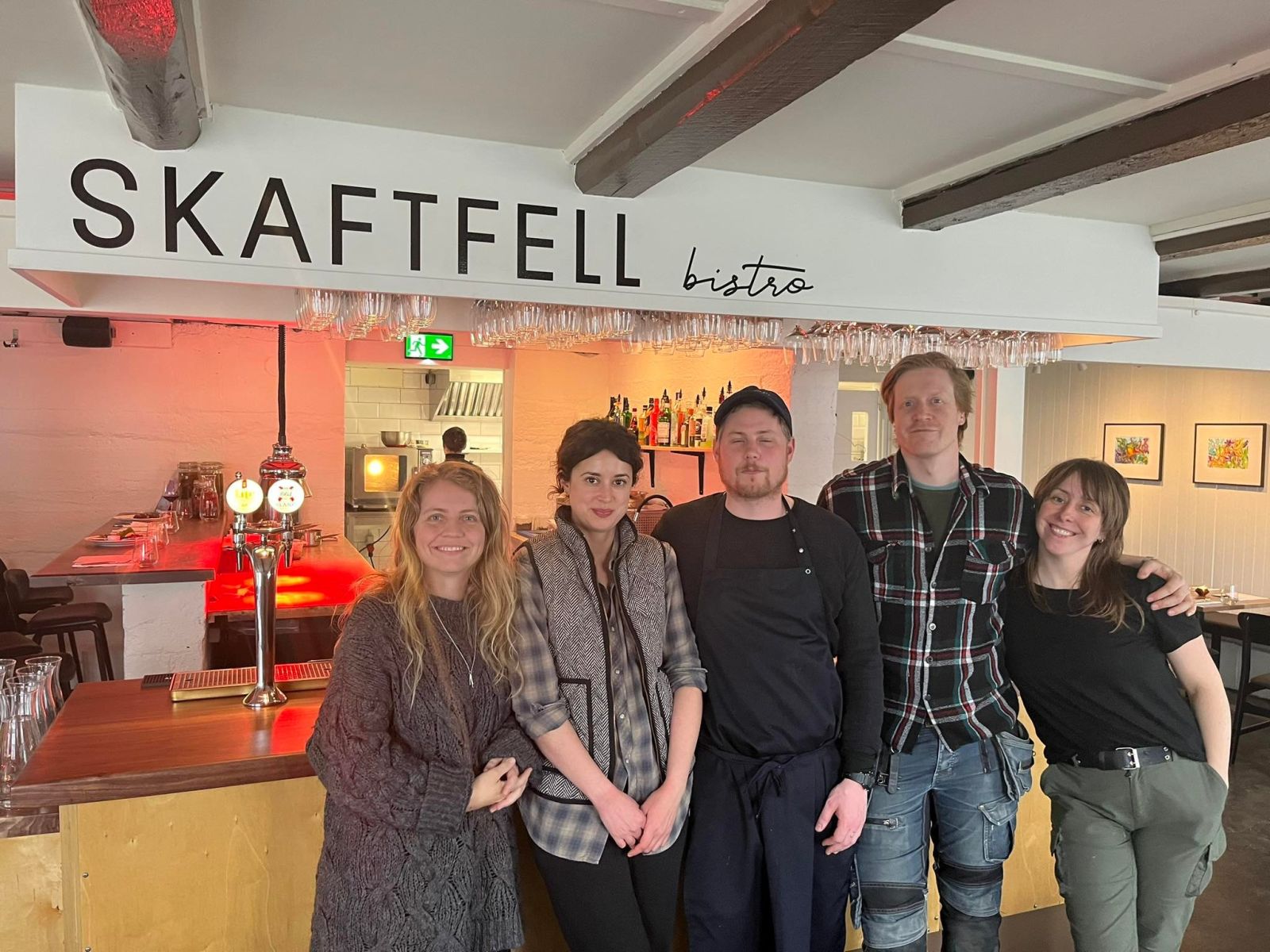 Sesselja, Eva, Garðar, Hjörvar og Sóley við barinn í Skaftfell bistro. Mynd: Aðsend