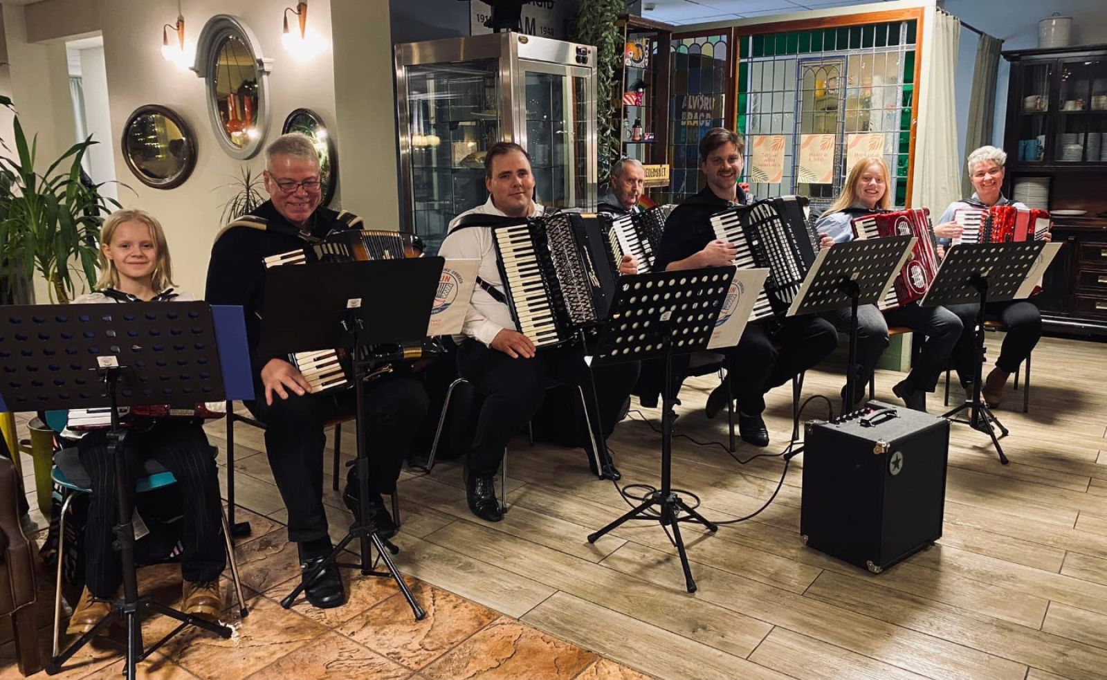 Nokkrir félagar í Félagi harmonikkuunnenda í Norðfirði munduðu nikkurnar á Hótel Hildibrand þegar þessi mynd var tekin. Mynd Aðsend.