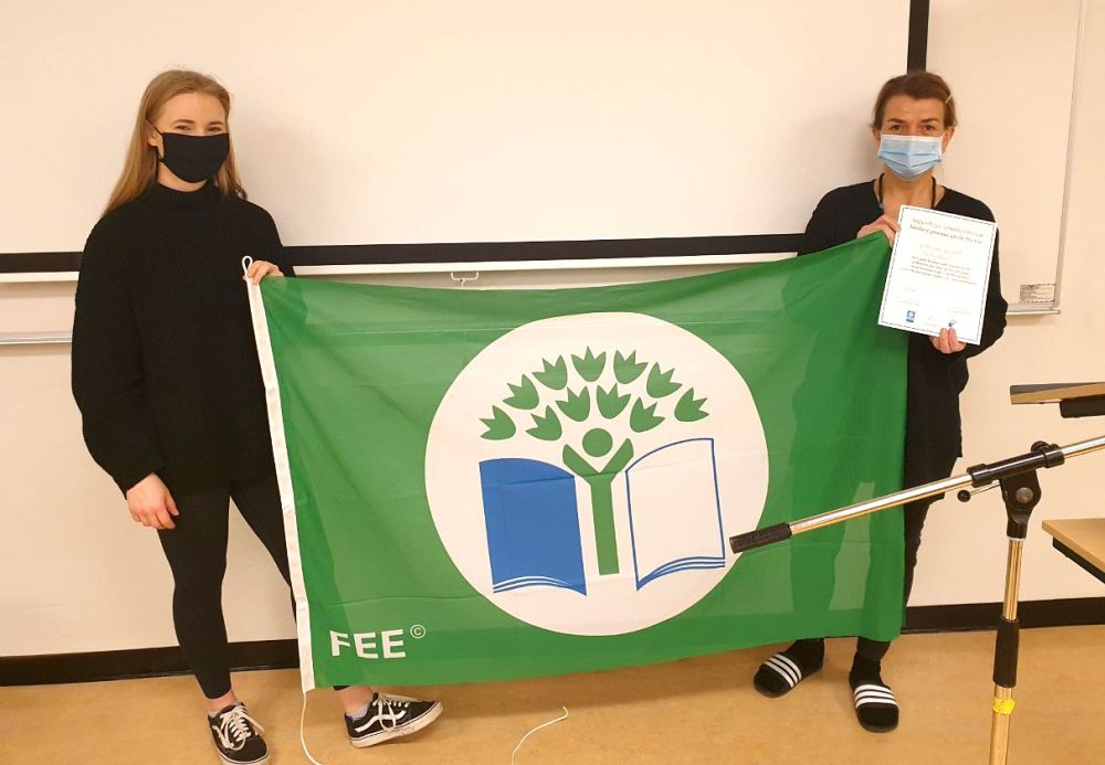Verkmenntaskóli Austurlands fékk s.l. haust annan Grænfána afhentan. Hér taka Alexandra Ýr Ingvarsdóttir, nemandi í umhverfisnefnd, og Gerður Guðmundsdóttir, kennari og formaður umhverfisnefndar við Grænfánanum fyrir hönd skólans. Mynd: Aðsend